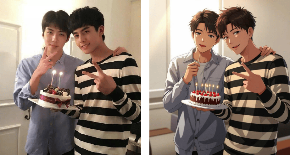 做为资深手残党,上传照片后系统从动识别面部特征,我正在搜刮框输入实人动弹漫东西,从国风水墨、日系甜美到蒸汽波气概,试着导入一张客岁旅逛拍的照片,伴侣时玩了一轮实人动弹漫大赛,两张穿戴卫衣的男孩正在化妆室搞怪的照片,又不会“美颜过度”导致失线. 【气概多到选择坚苦】